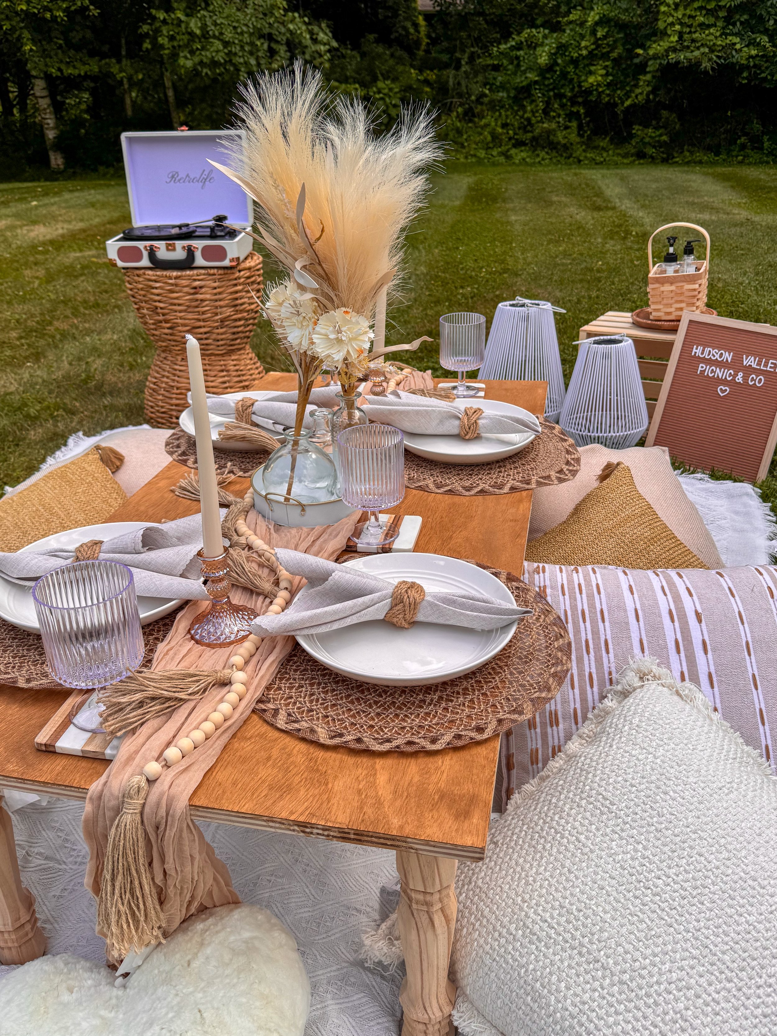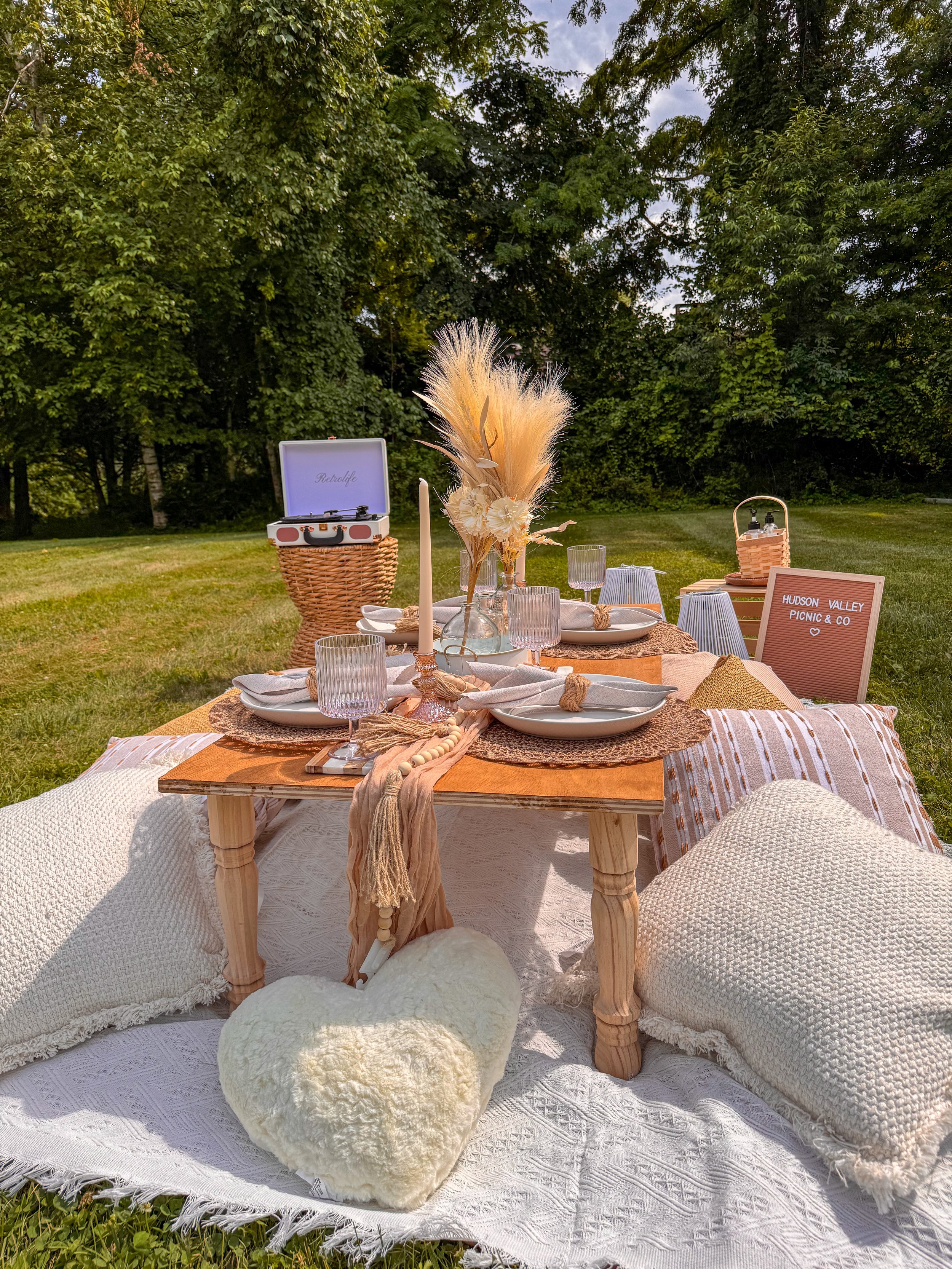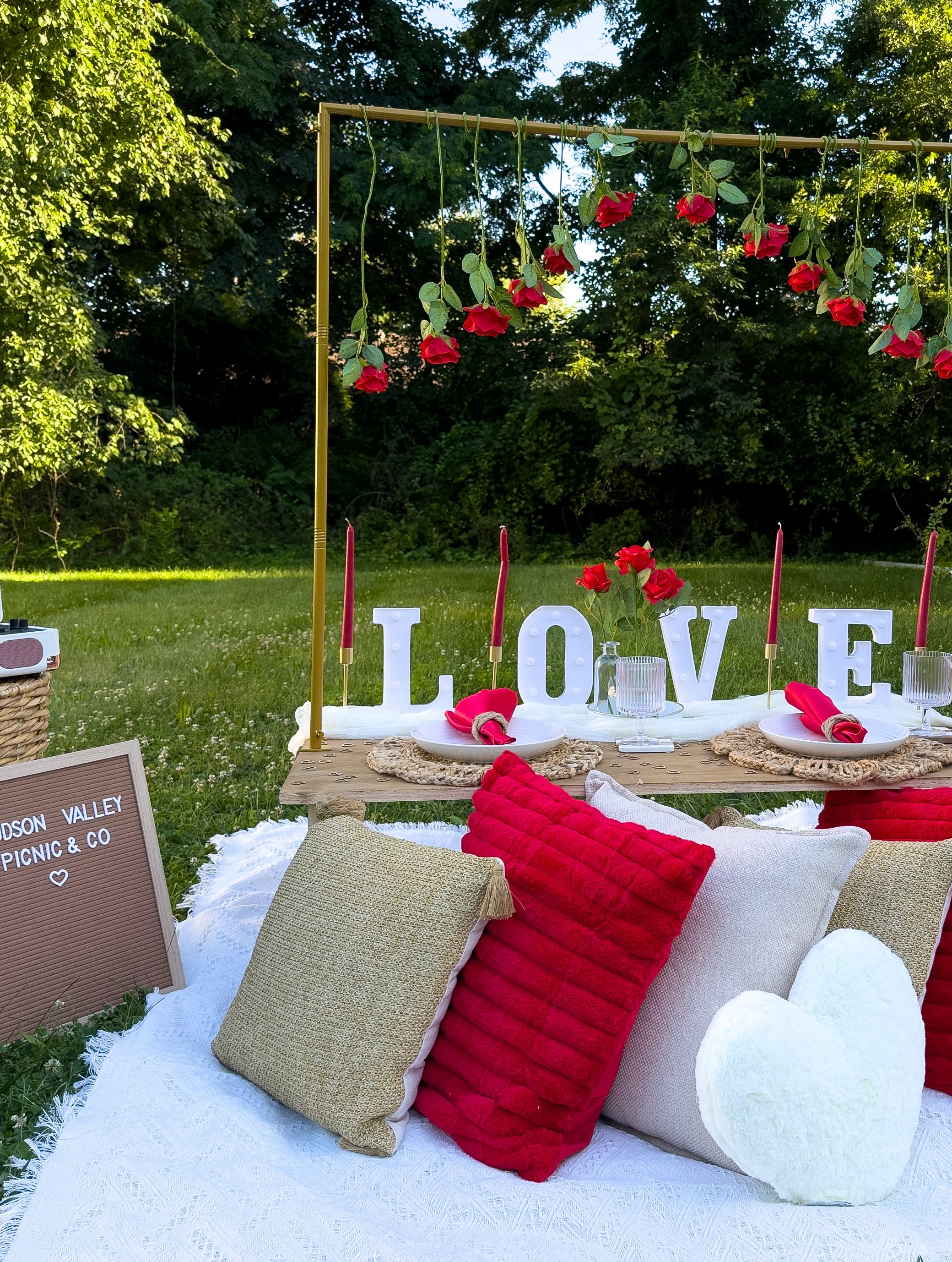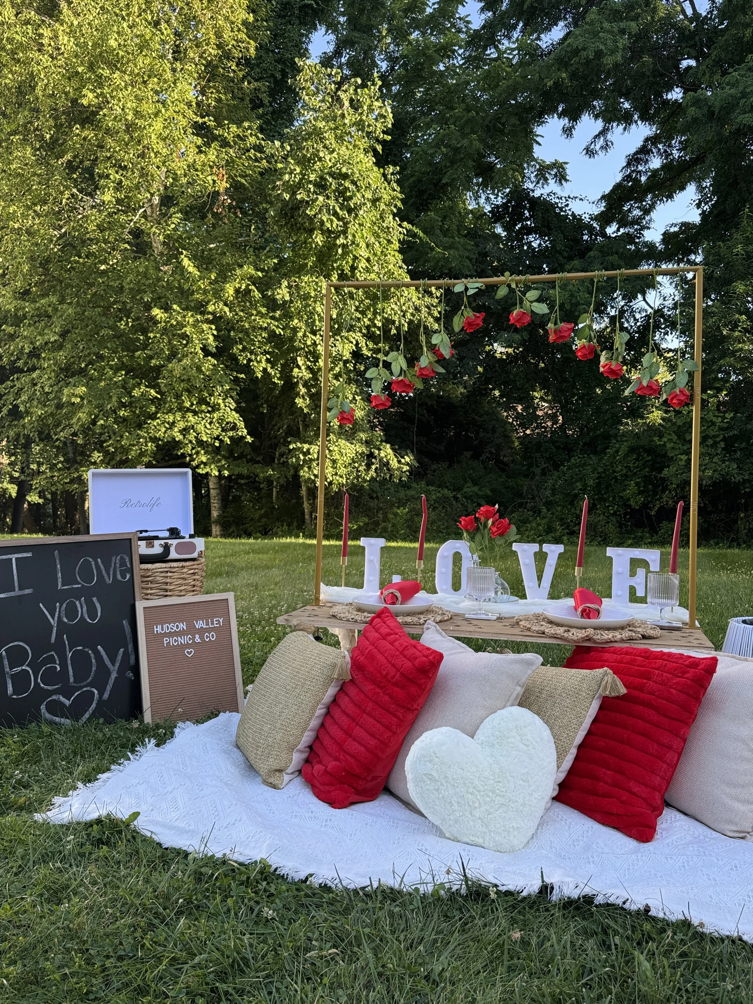 Intimate, elegant, and effortlessly romantic. Complete with red rose accents, candlelight, and plush seating, this picnic creates the perfect backdrop for love—whether it’s a date night, anniversary, or just because. A cozy moment made to be remembered.