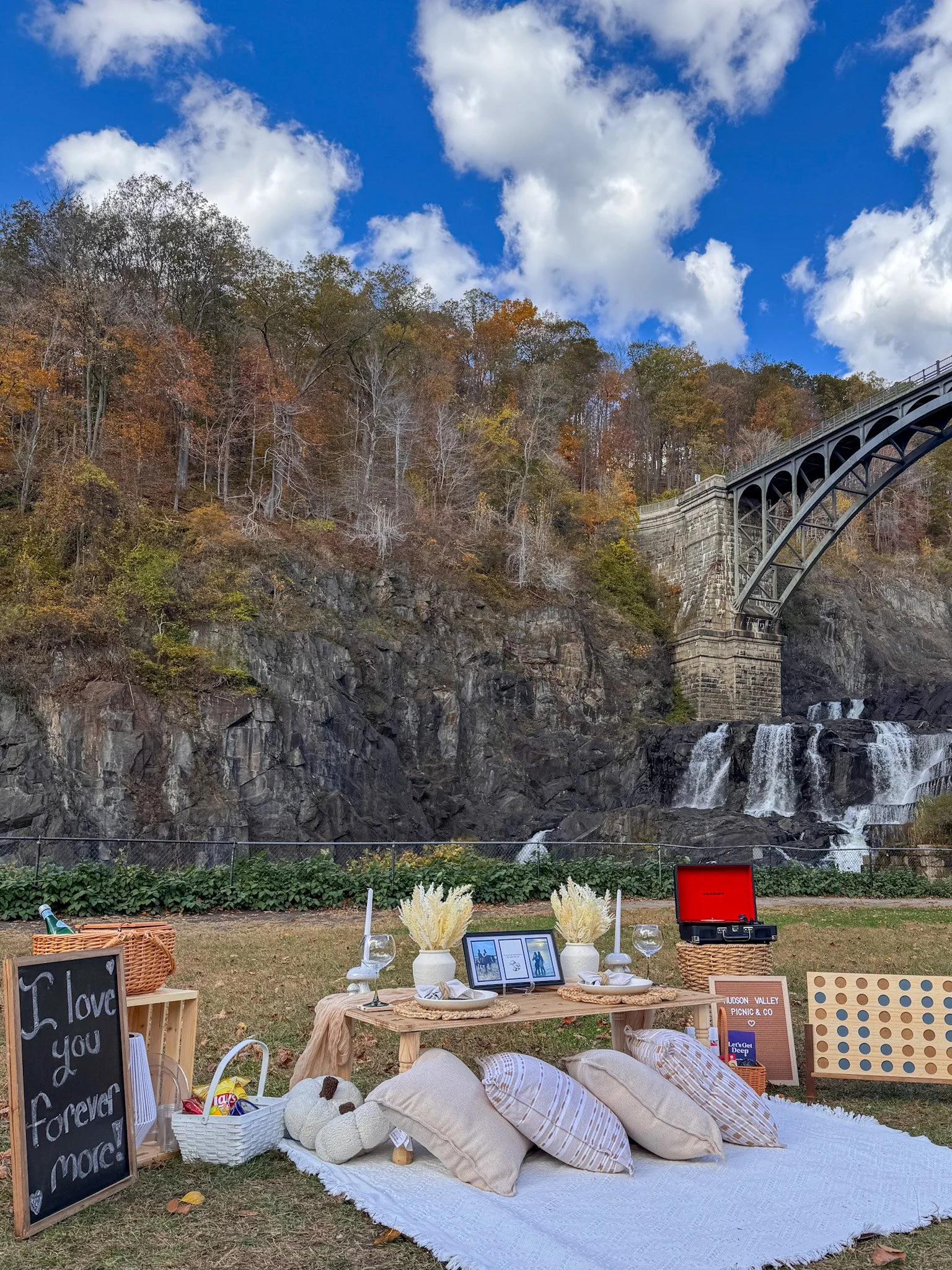 Set at the stunning Croton Gorge Park in Croton, NY, this post-proposal setup captured the joy of “yes.” Designed with whimsical mushroom accents to honor the couple’s love for collecting mushroom-shaped novelties, the picnic blended nature and romance for a cozy, heartfelt celebration of new beginnings.